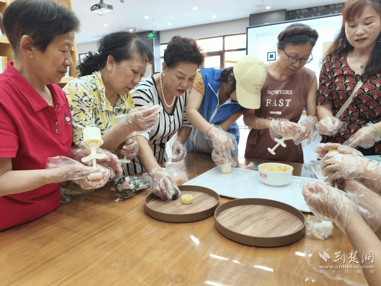 活动尾声,众人一同体验了传统糕点绿豆糕的制作。大家戴上手套,围聚桌旁,将淡绿色的绿豆粉团轻轻揉捏、分块,再仔细填入雕花模具中。随着“嗒嗒”的按压声,一块块精致的绿豆糕脱模而出,新鲜出炉。唇齿留香间,节日温情愈发浓厚。